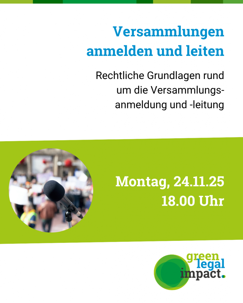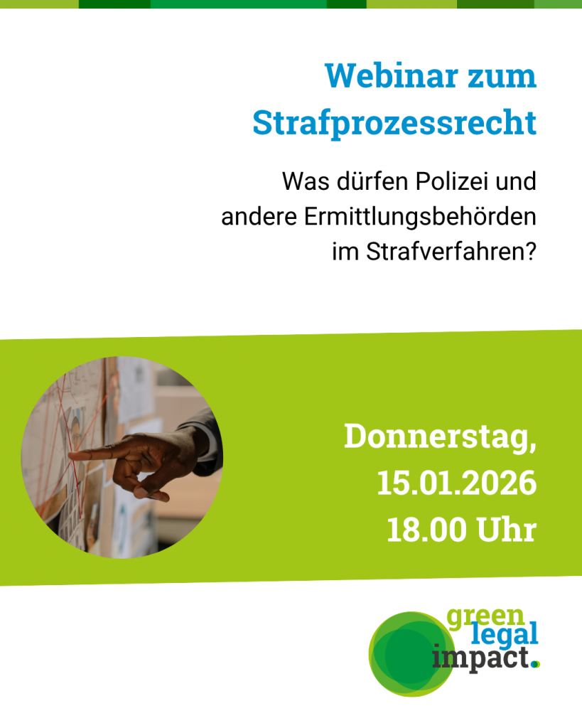 Weiterbildungen und Trainings gehören zu den wichtigen Angeboten von GLI. Das Green Legal Lab richtet sich an junge Jurist*innen, die ihre universitäre Ausbildung ergänzen wollen. Erfahrene Umweltjurist*innen vermitteln strategisches Vorgehen und umweltrechtliche Zusammenhänge. Außerdem bieten wir für die Zivilgesellschaft Webinare bzw. Seminare im Versammlungsrecht und verwandten juristischen Themen mit Umweltbezug an.